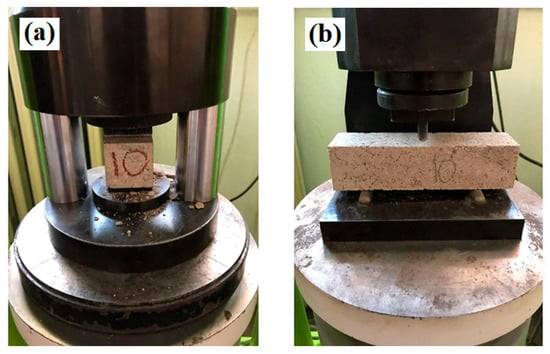 The samples used in the experiments were prepared according to ASTM C348 [36] and ASTM C349 [37] standards. The samples were cast in steel molds with dimensions of 40 mm × 40 mm × 160 mm. After casting, the samples were processed with a mold release agent and subjected to mechanical vibration for 3 min. At the designated testing time for each formulation, the samples were subjected to flexural and compressive strength tests. For the flexural test, three samples were taken from each formulation and tested according to ASTM C349 standards. Similarly, for the compressive strength test, six samples were taken from each formulation and tested according to ASTM C348 standards. Figure 3 shows images related to compression and flexural tests.