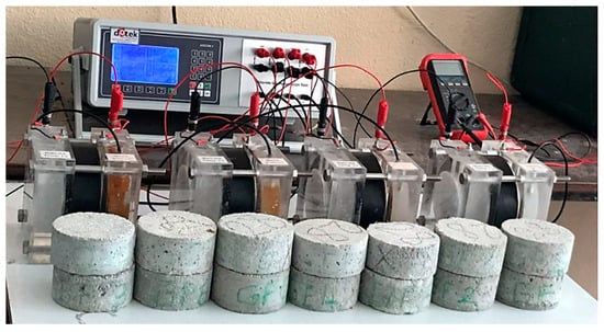 For chloride permeability, AAS mortars were prepared in Ø100 × 50 mm dimensions and subjected to chloride permeability testing. The rapid chloride ion penetration values of the samples were determined according to ASTM C 1202 [39]. A photograph taken during the chloride permeability tests is shown in Figure 4.