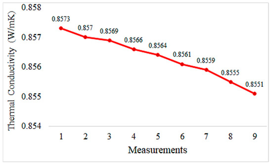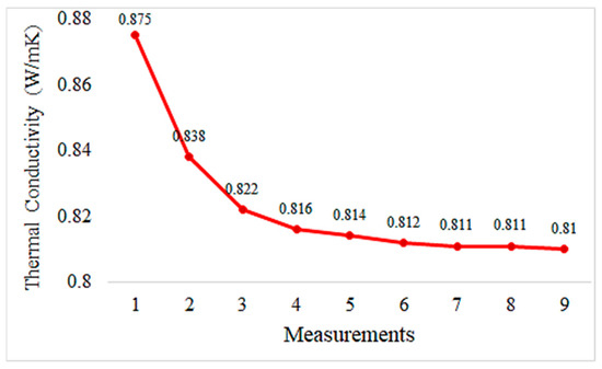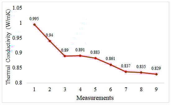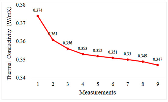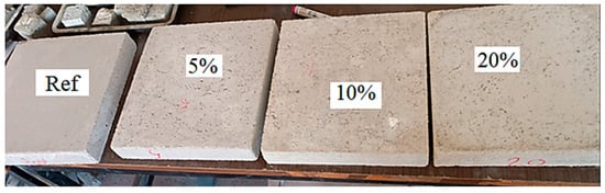 Thermal conductivity tests were conducted to determine the thermal insulation properties of the produced geopolymer mortars. The thermal conductivity values (Lambda λ) of hemp fiber-reinforced geopolymer samples were measured using a device in the temperature range of 15 to 25 °C. The conductivity measurements were performed on geopolymer samples prepared with dimensions of 300 × 300 × 50 mm. Figure 6 shows the experimental samples used for thermal conductivity measurements.