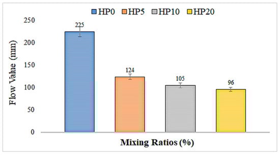 A graph based on the values obtained from the spread tests is presented in Figure 7. According to Figure 7, it is observed that increasing the hemp fiber ratio significantly reduces the spread value of the mortar. With the addition of 5% hemp fiber, a decrease of 22.5% occurs, with 10% addition, a decrease of 34.4% occurs, and with 20% addition, a decrease of 40% occurs.