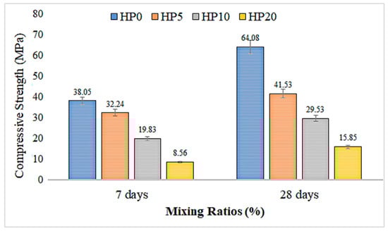 As the hemp fiber content increased to 5%, 10%, and 20%, the compressive strength of the geopolymer mortar significantly decreased. Specifically, at 7 days, the compressive strengths dropped to 32.24 MPa (HP5), 19.83 MPa (HP10), and 8.56 MPa (HP20), corresponding to reductions of approximately 15.3%, 47.9%, and 77.5%, respectively, compared to the control. At 28 days, the compressive strength values were 41.53 MPa (HP5), 29.53 MPa (HP10), and 15.85 MPa (HP20), showing reductions of 35.2%, 53.9%, and 75.3%, respectively.