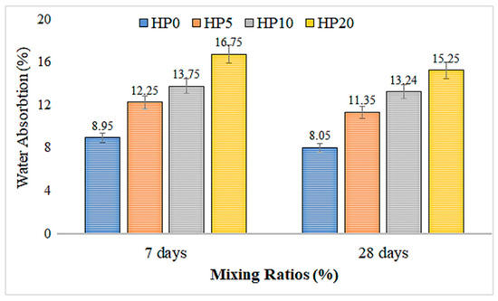 Figure 10 depicts a graph constructed based on the data obtained from water absorption tests of geopolimer composite mortars. Figure 10 depicts the water absorption rates of mortar mixtures with different proportions of added hemp fiber over 7-day and 28-day periods. The addition of hemp fibers significantly increased the water absorption rates of the mortar mixtures. The mixture containing 5% hemp fiber (HP5) exhibited water absorption rates of 12.25% at 7 days and 11.35% at 28 days, showing a marked increase compared to the control group (HP0). When the fiber ratio was increased to 10% (HP10), the water absorption rates were measured at 13.75% at 7 days and 13.24% at 28 days, recording higher values compared to the control group. In the mixture with the highest fiber ratio (HP20), the water absorption rate was observed to be 16.75% at 7 days and 15.25% at 28 days, indicating a significant increase in water absorption capacity with an increasing fiber ratio.