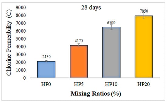 Figure 11 presents the graph constructed based on the data obtained from chloride permeability tests of geopolymer composite mortars. Figure 11 illustrates the chloride permeability results of geopolymer composite mortars containing various ratios of hemp fiber after 28 days of curing. The results reveal a significant increase in chloride ion permeability with the incorporation of hemp fibers.