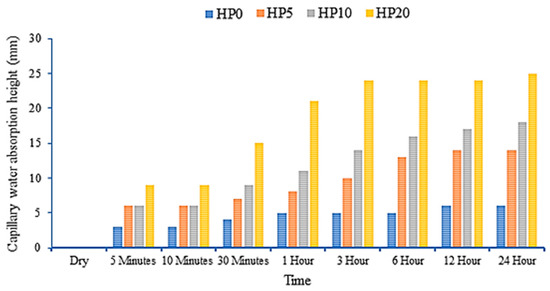 The capillary absorption test is conducted to measure the movement of water in capillary pores of a material. It is commonly used to determine the water absorption and permeability properties of materials such as mortar, stone, and wood. These tests provide information about the material’s water resistance, crack resistance, and overall performance. The capillary absorption test is typically conducted according to the ASTM C1585 [40] standard. An image related to the capillary absorption test is shown in Figure 5.