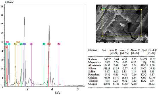 SEM imaging and EDX analyses of the geopolymer mortar samples were conducted using a scanning electron microscope (Carl Zeiss, Oberkochen, Germany) at 30 kV. The samples were coated with gold to prepare the surfaces for imaging and analysis.