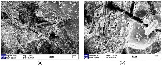 SEM and EDX analyses further supported these phase findings, especially in highlighting the effects of fiber addition on the microstructure. In the control sample (0% HF), SEM images showed distinct cracks and a rough surface texture, while EDX analysis confirmed high amounts of Si and Ca, supporting the presence of quartz and calcite phases identified in the XRD analyses. In the 5% HF-added sample, SEM images showed an even distribution of fibers within the matrix, with C-A-S-H phases concentrated at the fiber-matrix interface, exhibiting darker and more homogeneous appearances due to their amorphous nature. EDX analysis revealed high levels of Ca, Si, Al, and Na, corroborating the chemical structure and showing that the fibers facilitated the formation of these binding phases, in line with the work of Temuujin et al. [56] and Fernandez-Jimenez et al. [57]. For the 10% HF-added sample, the EDX analysis revealed a composition of 37.38% SiO2 and 33.25% CaO, confirming the chemical presence of the dominant mineral phases identified in the XRD analysis. These ratios indicate high mechanical strength and a denser microstructure, as noted by Ma et al. [58]. The 20% HF-added sample demonstrated a more intense and homogeneous fiber distribution, with C-A-S-H and N-A-S-H phases becoming more prominent in these areas. This enhanced the chemical bonding at the fiber–matrix interface, thereby improving the material’s mechanical strength. Additionally, the increased micro-porosity of these phases contributed to improved chemical durability, as observed by Poinot et al. [59]. Overall, the combined evaluation of SEM, EDX, and XRD analyses clearly demonstrates the positive effects of hemp fiber addition on the mineral phase formation, microstructure, and chemical durability of geopolymer mortars. The fiber incorporation, especially through the concentration of C-A-S-H and N-A-S-H phases, enhances both mechanical and chemical performance. These findings align with the work of Deb et al. [60] and Ma et al. [61], supporting the potential of geopolymers as sustainable building materials.