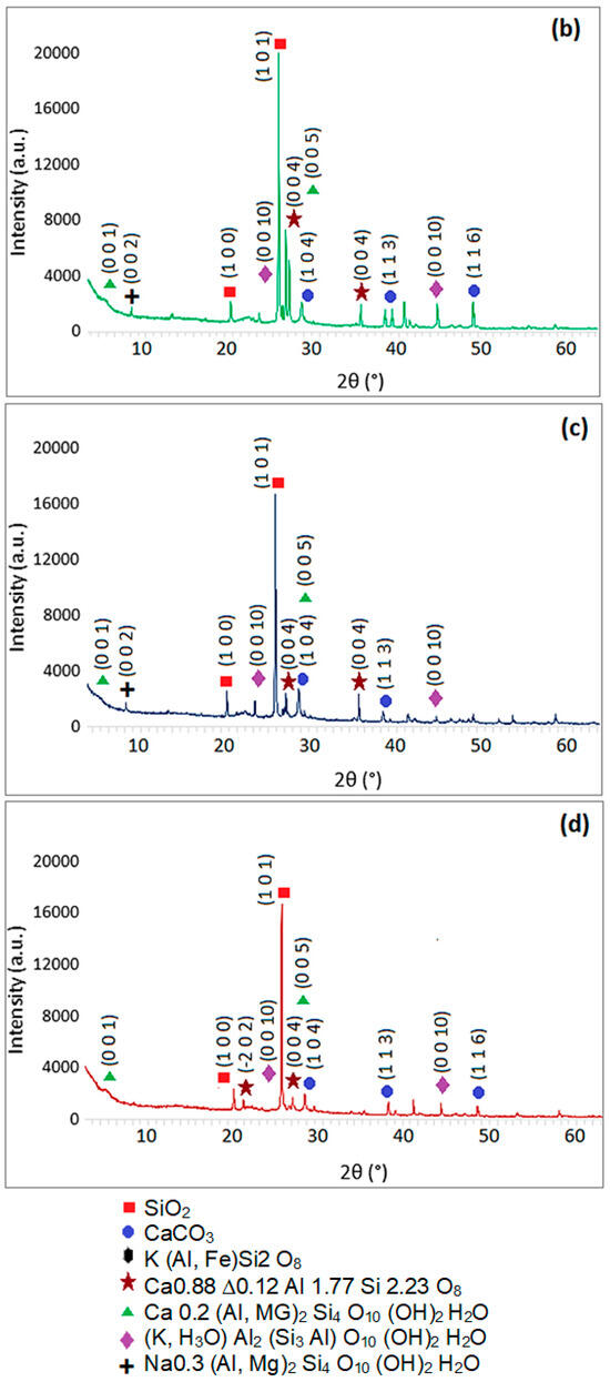 According to the XRD analyses, the predominant mineral phase in all samples was identified as quartz, with the most prominent peak observed at 26.63° 2θ in the (101) plane. However, important crystalline phases such as calcite and anorthite were also detected, attributed to the high content of silica sand and BFS in the composite structure. Additionally, some secondary phases were observed, showing low-intensity peaks in the XRD analyses.