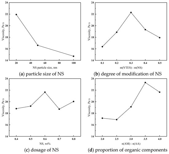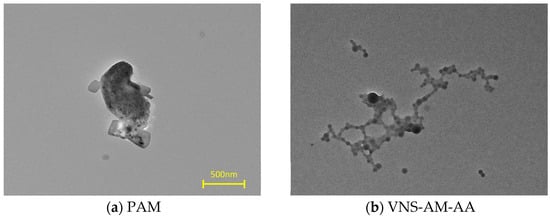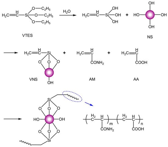 - The synthesized VNS-AM-AA achieved the best flocculation effect when NS was selected to be 20 nm, the mass ratio of silane coupling agent VTES to NS was 0.3, the addition of NS was 0.6% of the total mass of the monomer, and the molar ratio of the organic components AM and AA was 3.5:1. The relative molecular weight of the synthesized VNS-AM-AA was about 6 million at this time. FTIR, TEM, and SEM analyses showed that the synthesized polymer was the target product, and it did not easily agglomerate in water with a three-dimensional network effect.