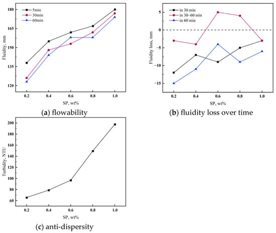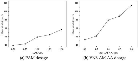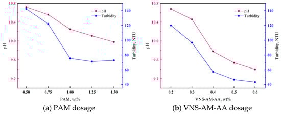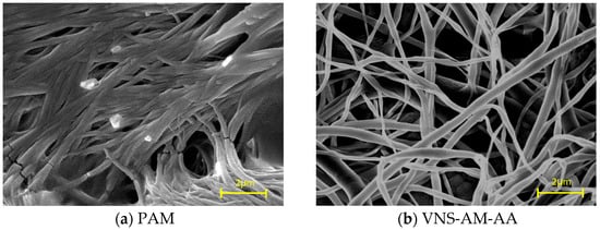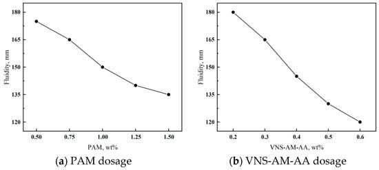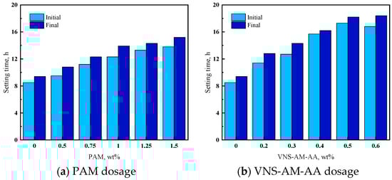 - The anti-dispersity experiment and the flowability experiment showed that the anti-dispersity of VNS-AM-AA was better than that of PAM at a smaller dosage, but its fluidity was more sensitive to the influence of the dosage, and it could be seen that the optimal dosage of VNS-AM-AA for combined fluidity and anti-dispersity was 0.4%. Due to the deeper entanglement of cement particles, the initial setting time of cement paste was delayed by 3–6 h and the final setting time was delayed by 3–9 h after mixing in VNS-AM-AA, which were higher than those of PAM. In actual construction, VNS-AM-AA should be used with a quick-setting agent to reduce the setting time.
