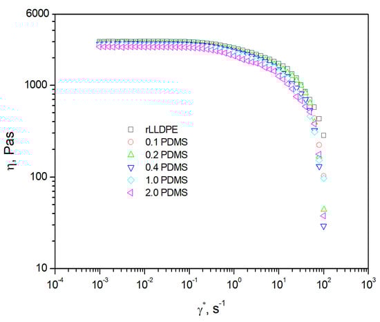 Viscosity curve for rLLDPE and rLLDPE modified with PDMS (0.1 PDMS–2.0 PDMS).
