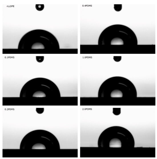 The main objective of the modification of the linear low-density polyethylene recyclate with the addition of PDMS was to reduce the wettability of the polymer’s surface in order to facilitate the removal of large-size rotational products of the molding process from the mold. Due to the presence of recurring non-polar -CH2- fragments in its structure, polyethylene is classified as a hydrophobic material [13], which means that it is poorly wettable and theoretically should not pose any major problems during the removal of products from the mold during processing. However, for recyclates, the de-molding of products may cause more difficulties compared to newly synthesized compounds due to changes in properties resulting from the presence of impurities [65] or caused by the degradation of the polymer [66]. Therefore, attempts to modify the recyclate with the aim of increasing it hydrophobicity seem justified, as this may speed up its processing compared to the original polyethylene. Changes in the surface hydrophobicity of rLLDPE were determined based on the wettability angle, the values of which are summarized in Table 3. The recyclate alone exhibits a water contact angle that is characteristic of commercial linear low-density polyethylenes [67,68], i.e., in the range of 88~94°. Example images of water drops deposited on the surface of the research materials are presented in Figure 2. A change in polyethylene surface wettability is already observed at a PDMS content of 0.1 wt.% (with the wettability angle increasing to 90.27 ± 0.767° from 88.25 ± 0.257°), which confirms the high effectiveness of the applied modification, and the observations are consistent with the results of studies carried out using original polymers [18,19]. The wettability angle increases with increasing PDMS content in the mixture, reaching the highest value, i.e., 102.47 ± 0.753°, for 2.0 PDMS. The increase in the hydrophobic character of the polyethylene recyclate surface is accompanied by a decrease in the dynamic friction coefficient (the second row in Table 3), which is practically associated with a reduction in friction force between plates made of the modified polymer and standard polyethylene film. In the adopted modifier concentration range (from 0.1 to 2.0 wt.%), the value of the dynamic friction coefficient varies within the range of 0.13 ± 0.011 to 0.06 ± 0.004. The addition of 2.0 wt.% PDMS reduced the dynamic friction between the examined surfaces by more than 50%. By juxtaposing the above-mentioned test results for the variations in surface hydrophobicity and the dynamic friction coefficient of rLLDPE with the relationships provided by the authors of [18], it can be inferred that the addition of PDMS will increase the efficiency of product removal from the mold and contribute to an acceleration of rotational molding process.