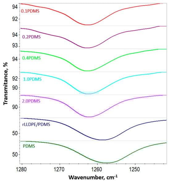 FTIR-ATR spectra in the wavenumber range of 1280–1240 cm−1, i.e., in the range of the Si-CH3 bond absorption band for pure PDMS, rLLDPE/PDMS concentrate and the tested polymer blends containing different concentrations of PDMS (0.1, 0.2, 0.4, 1.0 and 2.0 wt.%).
