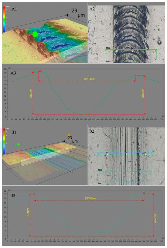 Microscopic analysis images of scratches for rLLDPE (A1–A3) and modified rLLDPE with PDMS (2.0 PDMS) (B1–B3)—scratch width analysis; (A1,B1)—digital spatial representation with depth attribute; (A2,B2)—real scratch image from the microscope; (A3,B3)—dimensioned profile of the indicated cross-section.