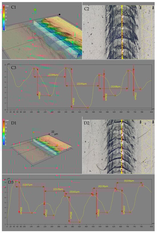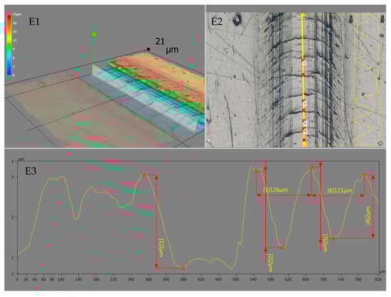 Microscopic analysis images of scratches for rLLDPE (C1–C3) and modified rLLDPE with PDMS (0.4 PDMS) (D1–D3) and (1.0 PDMS). (E1–E3)—scratch width analysis; (C1–E1)—digital spatial representation with depth attribute; (C2–E2)—real scratch image from the microscope; (C3–E3)—dimensioned profile of the indicated longitudinal section.