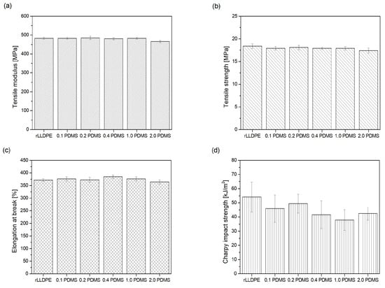 Mechanical properties of rLLDPE and polymer blends containing different concentrations of PDMS (0.1, 0.2, 0.4, 1.0 and 2.0 wt.%): (a) tensile modulus; (b) tensile strength; (c) elongation at break; (d) Charpy impact strength.