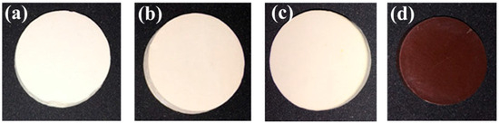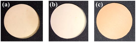The surface macro-morphologies of different CeO2-doped LST bulks (LC0, LC1, and LC2) are shown in Figure 1. A visible color difference can be observed with different CeO2-doped LST bulks sintered at 1450 °C. With the 20 wt.% CeO2 doping, the sintered bulk exhibits a significant color change. According to the experience obtained in a previous study, light-colored samples may exhibit a higher reflectivity [3].