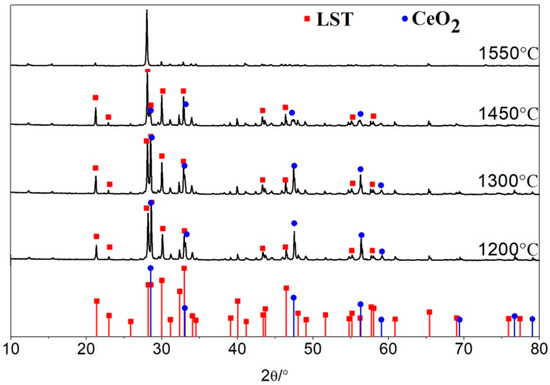 According to the XRD pattern shown in Figure 6, the phase structures of LST and CeO2 can be easily detected below 1450 °C, indicating that the LST and CeO2 have good thermal stability and no other new phase transform. However, some diffraction peaks at 1550 °C become weaker than those at any other low temperature, which can be explained by two aspects. On one hand, at that high temperature, a solid solution reaction of CeO2 and LST occurs, meaning that Ce4+ could replace the Ti3+ in LST. On the other hand, a long high-temperature sintering time causes grain growth and grain boundary reduction [22].