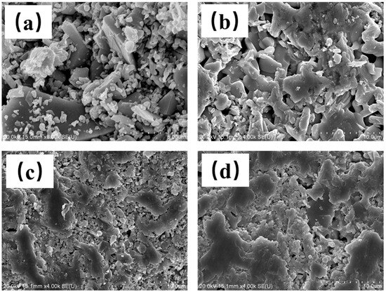 Surface microstructure of (a) LC5, (b) LC4, (c) LC1, and (d) LC3 samples.
