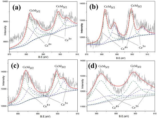 Total Ce3d spectroscopy of LST-CO samples. (a) LC5, (b) LC4, (c) LC1, and (d) LC3.