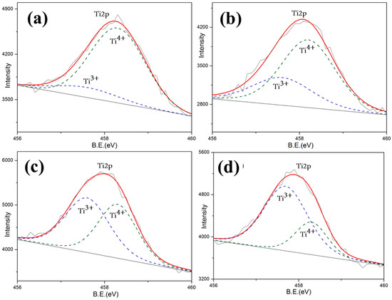 In order to further investigate the mechanism of the optical properties exhibited above, in-depth research into chemical valence was preceded by X-ray photoelectron spectroscopy (XPS) of 10 wt.% CeO2-doped LST. By analyzing the Ti2p and Ce3d energy bands of samples shown in Figure 8 and Figure 9, the valence states of Ti and Ce can be detected. Since the oxygen vacancy drives the Ti valence state from Ti4+ to Ti3+ and also drives the Ce valence state from Ce4+ to Ce3+ by giving additional electrons, the variation in oxygen vacancy can be calculated by the content of Ti4+ and Ce4+.