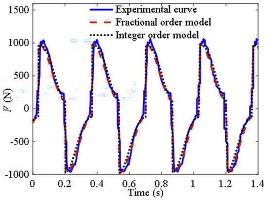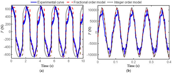 Based on the experimental data from the third group, the parameters of the fractional-order model identified using the same method as before are b0 = 0.087 and μ = 1.98. At this point, the derivative order approaches two, indicating a higher proportion of inertial effects and a lower proportion of damping effects. Similarly, the parameters were substituted into the fractional-order model and the existing model and compared with the experimental data, as shown in Figure 4. It can be seen from the figure that the fractional-order model can accurately fit the experimental data.