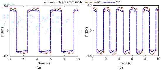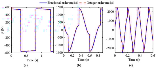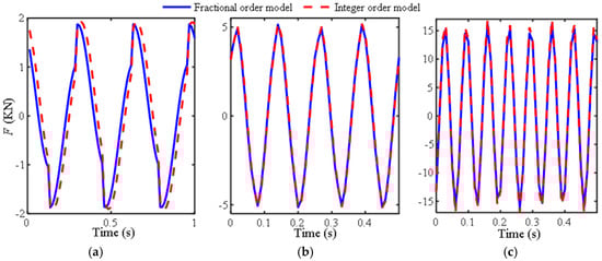 Similarly, to demonstrate the applicability of the fractional-order model, a comparison chart between the model and existing integer-order models is provided for other excitation frequencies (0.5 Hz, 8 Hz, and 12 Hz) and amplitudes (15 mm, 5 mm, and 5 mm), as shown in Figure 5. All three graphs show that the curves of the two models almost overlap, indicating that the fractional-order model fitting of the fluid inerter in reference [12], which mainly utilizes inertia, is more effective.