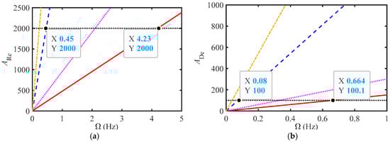 Based on the structural parameters from two references ([10] and [12]) and Equations (13) and (15), the variation curves of ARe and ADe with Ω were plotted as shown in Figure 7. In the figure, the solid red line and the dotted purple line represent the curves for excitation amplitudes of 5 and 10 mm, respectively, according to reference [12]; the blue dashed line and orange dotted line represent the curves for excitation amplitudes of 5 and 10mm, respectively, according to reference [10].