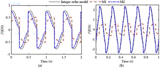 Research has found that when the excitation frequency is 0.5 Hz, no matter how optimized the identification is, the derivative order is always less than one. Furthermore, using the model (M2) identified by 12 Hz to describe the low-frequency characteristics may result in significant errors. Therefore, M1 is suitable for describing the ultra-low frequency region, but as shown in Figure 2a, there are still some differences between the curves of traditional and fractional-order models and experimental data. From Figure 2b, the three curves in the figure have a high degree of overlap. The parameters identified at a frequency of 12 Hz are more in line with the requirements of the inerter, with an order close to two and a relatively small b0, indicating that both traditional and fractional-order models have high accuracy at this time.