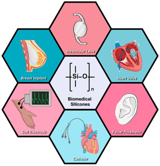 Silicones are polyorganosiloxanes of different chemical structures, having inorganic silicone–oxygen backbone (≡Si-O-Si≡) and organic substituents. Polydimethylsiloxanes –(Me2SiO)n– (Me = CH3) (PDMS) of linear structures are most often used. Silicones exhibit good thermal and chemical stability. However, the C–Si bonds are sensitive to oxidation due to thermodynamic aspects, but they show kinetic stability. The silicone–oxygen bonds are very strong and the siloxane (Si–O–Si) backbone shows a high degree of flexibility, and high chemical and thermal stability, depending on the kind of organic substituents at silicone atoms [1,2,3,4,5]. Silicone materials have found practical applications in many areas for more than 60 years: from oils used in heating baths to biomedical materials (e.g., as an artificial heart) [6,7]. Improvements in the surface, rheological, mechanical, and electrical properties of silicones were achieved with the use of different additives and led to their newer medical applications, as it was reported by Marmo and Grunlan [4]. An excellent and comprehensive review of numerous application fields of silicone biomaterials was presented by Zare et al. [1]. Many examples of silicone implants in the human body were described in the literature [1,8,9]. The most important examples of applications of biomedical devices fabricated with the use of silicone-based materials are illustrated in Figure 1 [5].