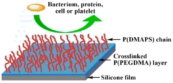 Silicone surfaces were often modified with different polysaccharides: chitosan, carboxymethyl chitosan, hyaluronic acid, fibrinogen, heparin, or cationic aminocellulose. As coating agents for biomedical applications, silicones were often used as polysaccharides. For example, the silicone surface layer modified with 3-(glycidoxypropyl)trimethoxysilane was cured with aminocellulose. Polysaccharides repelled proteins, improved cell viability, and showed antimicrobial properties. Multifunctional coatings prepared with the addition of polysaccharides and antibiotics gave antimicrobial properties. Before grafting polysaccharides, silicone surfaces were biofunctionalized with different antimicrobial reagents. Silicones having a low surface free energy were often activated on their surface in order to increase the interactions of silicones with bioactive agents [26,33,34]. For this purpose, many different chemical oxidations and high-energy etching methods were used: UV/Ozone etching [35,36,37,38], corona discharge [39], plasma treatment [40], and other techniques [34]. The silicone surface was also activated by oxygen and ammonia plasma by Roth et al. [41]. Alternatively, silicone surfaces were first activated by oxygen plasma and next coated with biocompatible polymers [polyethylene glycol (PEG), polyvinylpyrrolidone (PVP)] or 2-hydroxyethyl methacrylate (HEMA) by physicosorption or the preparation of polymer brushes with well-defined nanostructures via the “grafting from” or “grafting to” methods. PDMS surfaces modified with polysaccharides showed long-term hydrophilicity during storage in air. A patterned surface modification of PDMS silicone with cellulose gave spatial alternating hydrophilic and hydrophobic zones on the silicone surface [42].