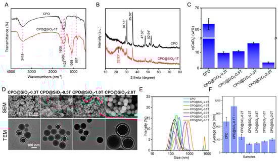 Characteristics and morphology of CPO@SiO2 nanoparticles. (A) FT-IR spectra and (B) XRD patterns of CPO and CPO@ SiO2-1.0T. (C) Calcium peroxide content in CPO and CPO@SiO2. (D) SEM and TEM images of CPO@SiO2-0.3T, CPO@SiO2-0.5T, CPO@SiO2-1.0T, and CPO@SiO2-2.0T. (E) Size curves and (F) average sizes of different CPO@ SiO2 nanoparticles measured using DLS.