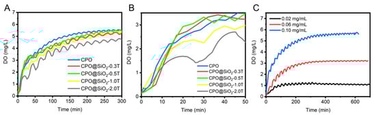 Oxygen-generating behaviors of CPO@SiO2. (A,B) Oxygen-generating curves of CPO and CPO@ SiO2 nanoparticles with different shell thicknesses of SiO2 shell at 0.10 mg/mL. (C) Oxygen-generating curves of CPO@ SiO2-1.0T with different concentrations.