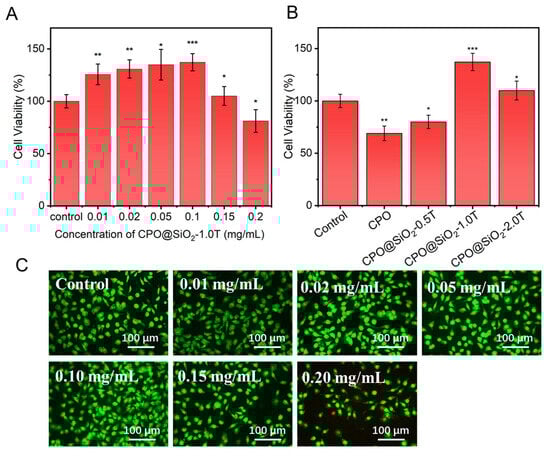 The cell viability of L929 cells cultured in the presence of (A) CPO@ SiO2-1.0T with different concentrations and (B) 0.1 mg/mL of CPO@SiO2 nanoparticles with different shell thicknesses (* p < 0.05, ** p < 0.01, *** p < 0.001). (C) AO/PI staining images of L929 cells cultured in the presence of CPO@SiO2-1.0T with different concentrations.