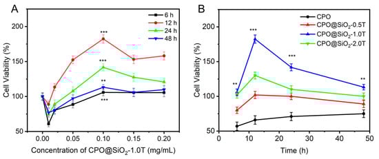 The viability of cells cultured under hypoxia for 48 h in the presence of (A) CPO@SiO2-1.0T nanoparticles with different concentrations and (B) CPO@SiO2 nanoparticles with different shell thicknesses at 0.1 mg/mL (** p < 0.05, *** p < 0.001).