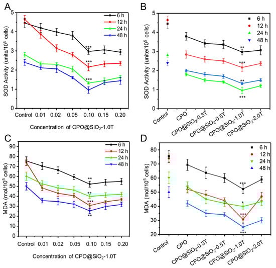 The SOD activity of L929 cells cultured within 48 h in the presence of (A) CPO@SiO2 nanoparticles with different concentrations and (B) CPO@SiO2-1.0T nanoparticles with different shell thicknesses at 0.1 mg/mL. The MDA level of L929 cells cultured within 48 h in the presence of (C) CPO@SiO2 nanoparticles with different concentrations and (D) CPO@SiO2-1.0T nanoparticles with different shell thicknesses at 0.1 mg/mL. (* p < 0.01, ** p < 0.05, *** p < 0.001).