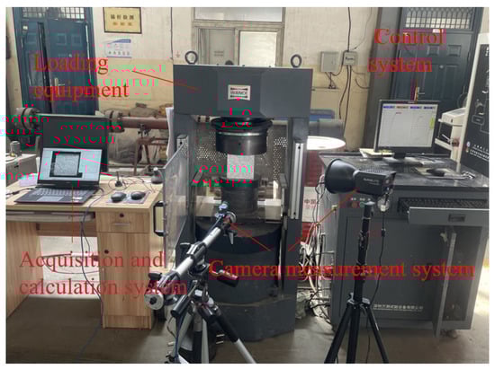 Figure 3 illustrates that this test relied on the electro-hydraulic servo rock triaxial apparatus. The recycled concrete specimens were placed in the center of the concrete pressure testing machine pedestal, with the top surface of the load plate aligned vertically with the top of the concrete specimen. For the split tensile tests, two steel rods were placed at the upper and lower portions of the concrete to ensure that the steel rods were positioned at the center of the concrete. The loading was performed using a displacement-controlled method with a loading rate of 0.05 mm/min.
