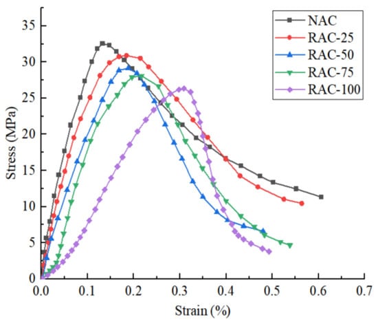 The stress–strain curves of concrete specimens with different recycled aggregate substitution rates.