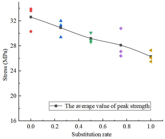 The peak strength of concrete specimens with different recycled aggregate substitution rates.