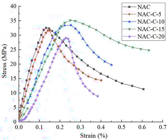 Figure 6 shows the stress–strain curves of the original concrete NAC under different CGP contents.