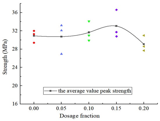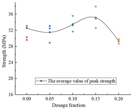 It can be seen that when the content of CGP is less than 15%, the specimen only exhibits the stages of elastic deformation, crack propagation, damage failure, and sustained loading, while the compaction stage is not clearly evident. When the content of CGP increases from 0 to 5%, the peak strength of the concrete decreases slightly, with a decrease of only 3.2%. With the increase in the CGP content, when the content reaches 15%, the peak strength of the concrete is the largest, and the specimen with CGP is increased by 8.1%. After that, with the increase in the CGP content, the peak strength of the concrete decreases sharply and is 16.6% lower than the maximum value. In Figure 7, it can be seen that the optimal dosage of CGP is 15%, and the peak strength of the concrete reaches the maximum value. In addition, when the dosage reaches 20%, the value is lower than that of the concrete without CGP.