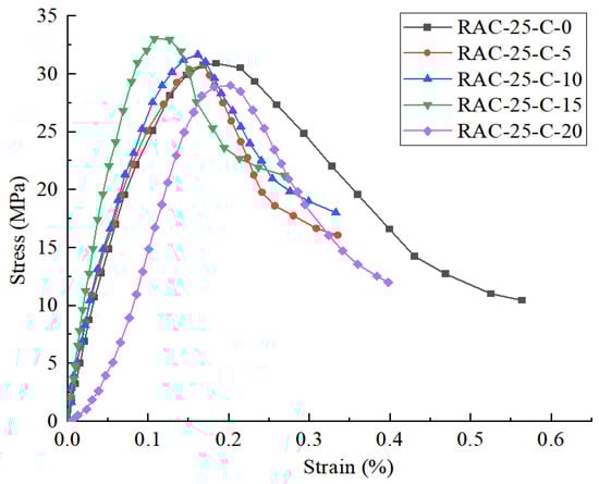 Figure 4 shows the stress–strain curves of the concrete specimens with different replacement rates of 10–20 mm coarse aggregate. Figure 5 presents the peak strength of concrete specimens at various rates of recycled aggregate substitution.