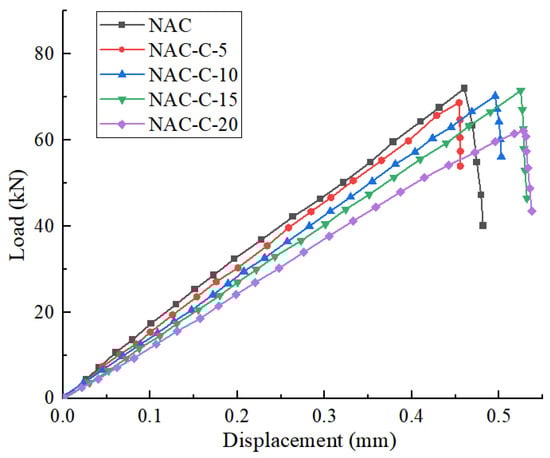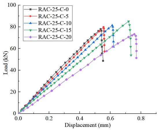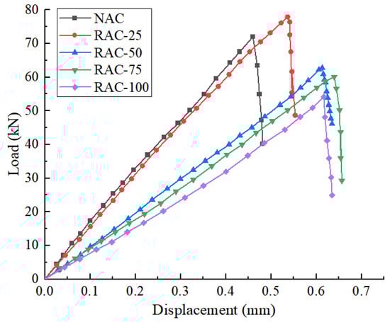 The load–displacement curves of concrete specimens with different RA substitution rates.