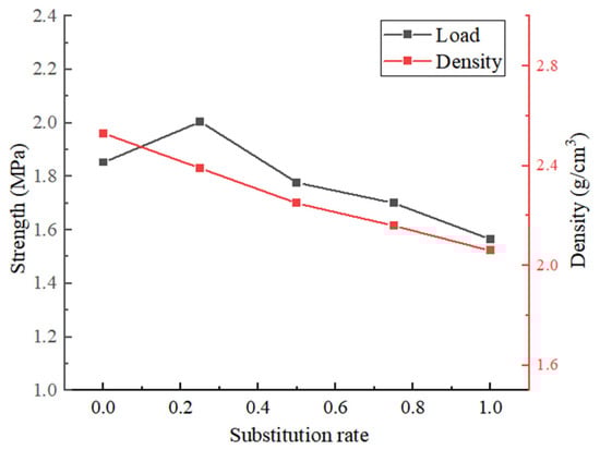 The shape, particle size, porosity, surface structure, and apparent density of concrete aggregate have a great influence on the mechanical properties of recycled aggregate concrete. The strength of recycled concrete is reduced, which is mainly caused by the porosity of the concrete because of the porous structure of recycled coarse aggregate. Because the recycled coarse aggregate has porosity, the water transport process in the interfacial transition zone will be relatively smooth, allowing it to reach the concrete to produce a more hydration process [27]. Therefore, the water absorption capacity of recycled aggregate is very strong, which will lead to uneven water absorption of the natural aggregate around it, resulting in a decrease in the splitting strength and compressive strength of recycled concrete.