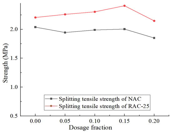 The splitting tensile strength of RAC-25 and NAC is shown in Figure 14. For concrete specimen RAC-25, when the CGP content increases from 0 to 15%, the splitting tensile strength of the specimen increases slightly with the increase in the CGP content. When the content reaches 15%, it reaches its peak value, at which point the splitting tensile strength of the specimen is 7.9% higher than that of non-coal-gangue-powder-added specimen RAC-25. However, after this point, the splitting tensile strength of the specimen sharply decreases with the increase in the CGP content. When the content reaches 20%, the splitting tensile strength of the specimen is 2.9% lower than that of the RAC-25 specimen.