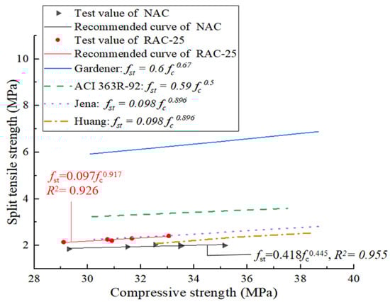The tension–compression ratio, which is the ratio of splitting tensile strength to compressive strength of concrete, is the main indicator to measure the brittleness of concrete. Many scholars have performed research on the relationship between the tension and compression ratio of concrete. Based on a large number of experimental data, a variety of analytical models have been proposed, as shown in Figure 15. Based on the experimental data of CGP recycled concrete, the relationship between splitting tensile strength and compressive strength is given by the least squares method. Formula 1 and Formula 2 are the prediction models of the original concrete NAC and the recycled concrete RAC-25, respectively. The formula proposed in this study shows the same trend as the existing prediction model. The models proposed by Gardener [24] and ACI 363R-92 [25] are higher than the test values, while the prediction equations provided by Jena [26] are closer to the test values in this study.
