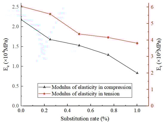 The elastic modulus E is the ratio of the stress and the corresponding strain of the material in the elastic deformation stage. According to different stress conditions, there are corresponding values of the tensile elastic modulus (Et), the compressive elastic modulus (Ec), the shear elastic modulus, and the bulk elastic modulus. The curve in Figure 16 reflects the variation in the elastic modulus of the recycled concrete under different coarse aggregate replacement rates.