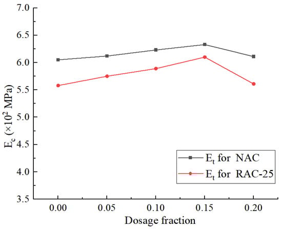As shown in Figure 17, the variation trend in the tensile modulus (Et) of both the native concrete specimens (NAC) and the recycled concrete specimens (RAC-25) concerning the CGP content is essentially the same.