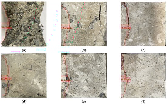 The failure characteristics of RAC-25 with different contents of CGP at peak strength: (a) specimen NAC, (b) specimen RAC-25, (c) specimen RAC-25-C-5, (d) specimen RAC-25-C-10, (e) specimen RAC-25-C-15, and (f) specimen RAC-25-C-20.