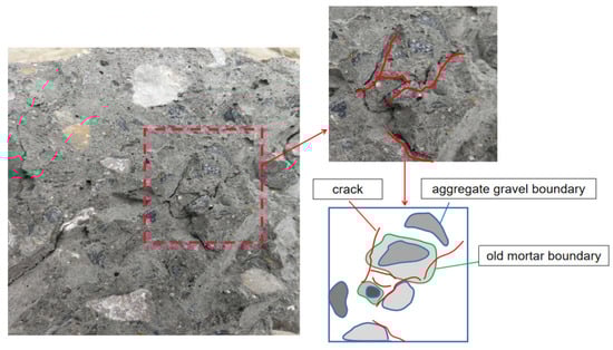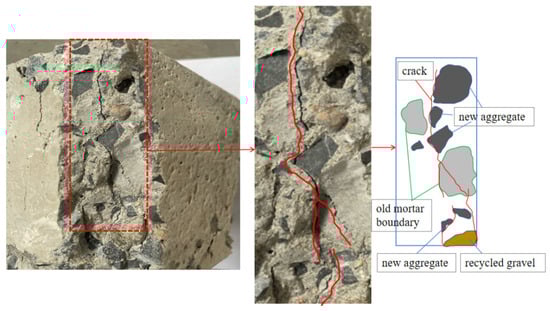A large number of studies have shown that the physical and mechanical properties of recycled aggregate have significant effects on the failure characteristics and cracking mode of concrete. Reference [11] used digital image correlation technology to explore the failure process of recycled block concrete under compression loading. The results showed that when the strength of new and old concrete was close, the joint surface of new and old concrete was not an obvious weak part in the uniaxial compression test. References [12,13] found that when the strength of waste concrete was lower than that of new concrete, the increase in the replacement rate of waste concrete block would lead to a decrease in the splitting tensile strength of recycled block concrete. When the waste concrete block was broken off the recycled concrete block, the inevitable micro-cracks and the interface between the new and old concrete could become seepage channels, which had adverse effects on the mechanical characteristics and durability of the recycled concrete [14]. In Reference [15], crack propagation was modeled by using fracture mechanics, simulation, and machine learning (ML), and experiments were carried out on various famous crack image datasets. Wang et al. [16] found that the shear strength of natural concrete (MNC) was the highest, followed by simulated recycled concrete (MRC). The shear cracks of MNC first appeared in the interface transition zone (ITZ) and expanded, resulting in shear failure. The above research results show that the existence of old mortar makes the interface transition zone more porous, which is the fundamental reason for the deterioration of recycled concrete performance and durability [13,17].