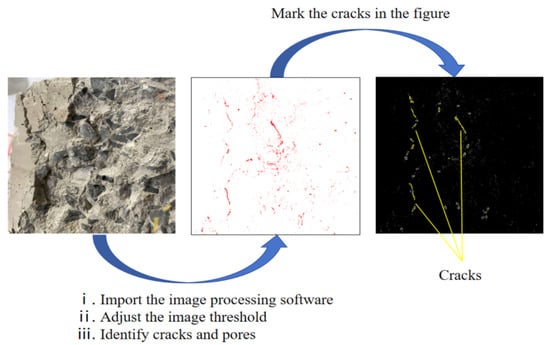 The distribution law of internal cracks after concrete failure can reflect the failure mechanism and mechanical characteristics of concrete to a certain extent. Digital image processing software was used to identify the pores and cracks in the image, and the cracks in the image were marked so as to obtain the distribution characteristics of cracks and the proportion of cracks. Figure 25 shows the process of calculating the crack ratio.